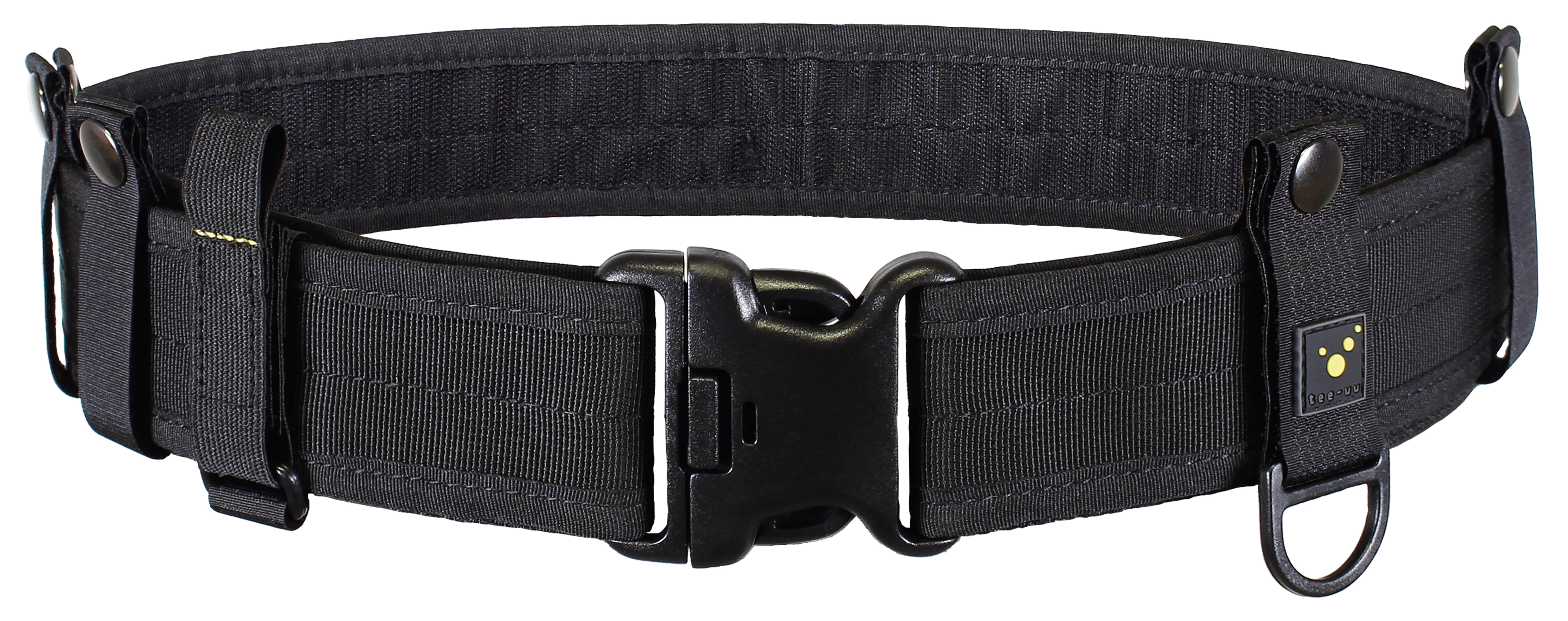Furthermore, a total of four fixation straps for holsters, one of them with plastic eyelet for attachment of a key ring or similar items are included in delivery. The fixation straps provide for firm hold of all holsters which are attached to belt. Additional strap with unique GLOVE-FIX system from TEE-UU for attachment of protective gloves is also included in delivery. Gloves only need to be folded and fixated with the hook-and-loop fastener and therefore are immediately at hand, when needed.